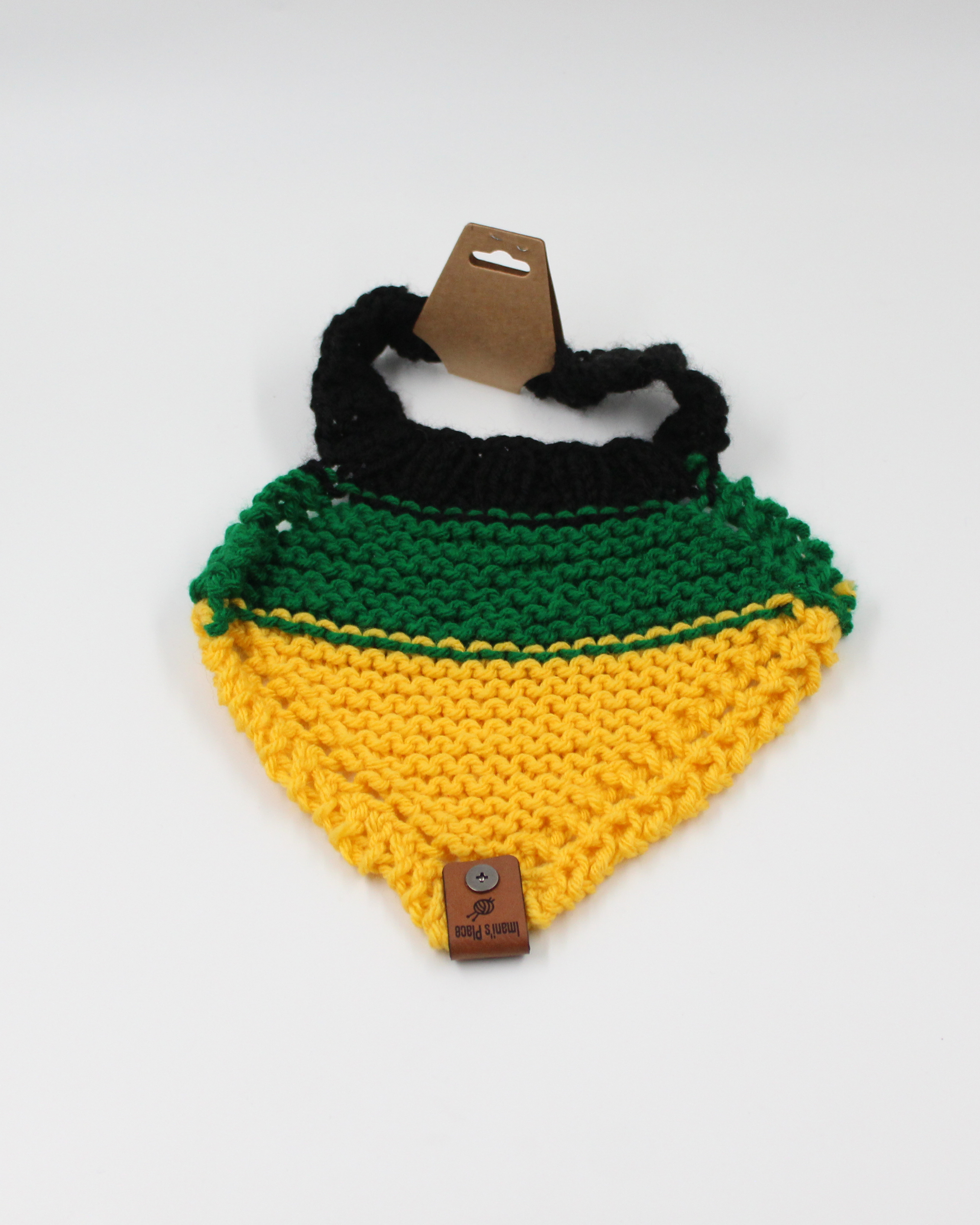 Have baby represent Jamaica with pride wearing this handmade knit baby bib using the Jamaican flag colours!